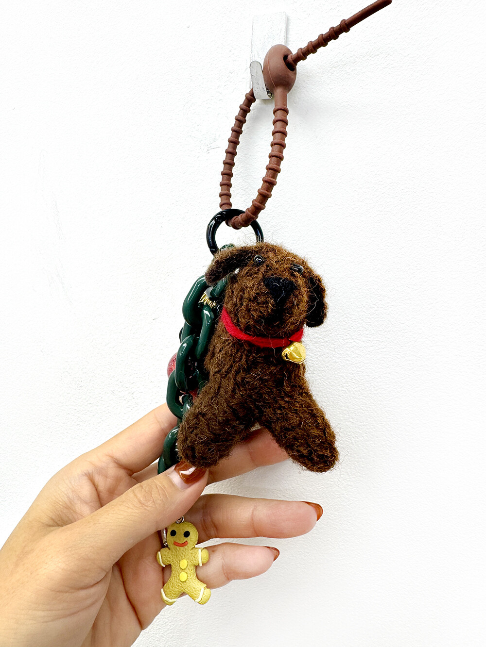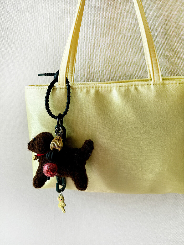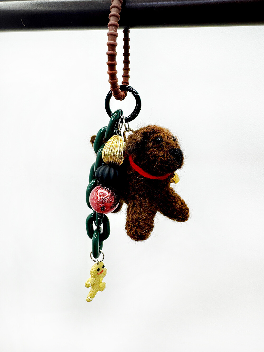빨간 실에 골드 미니벨을 달고 있는 복실복실 퍼피 백참 입니다.