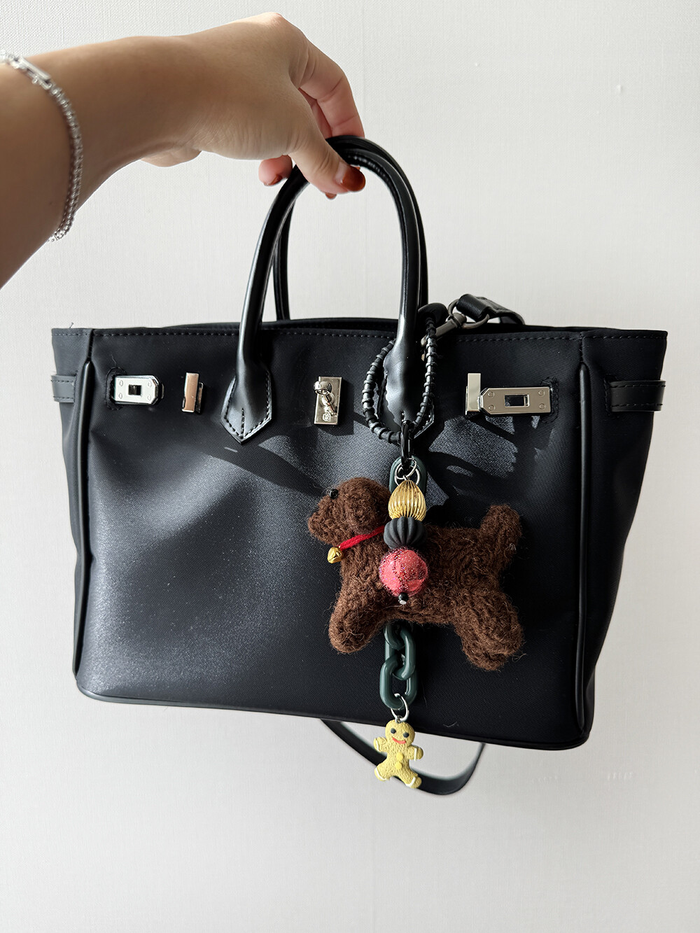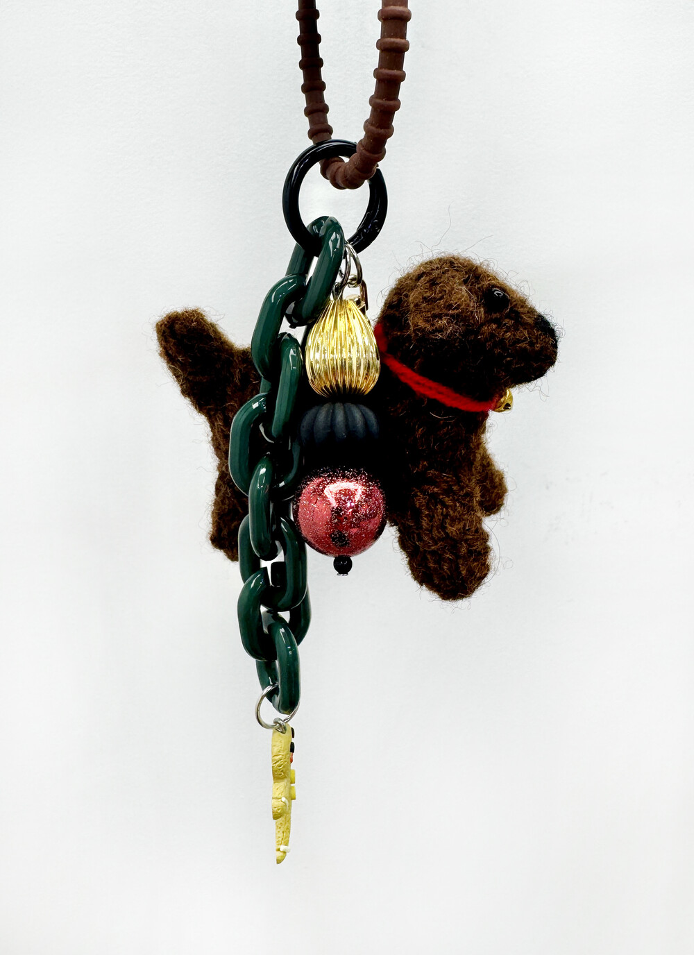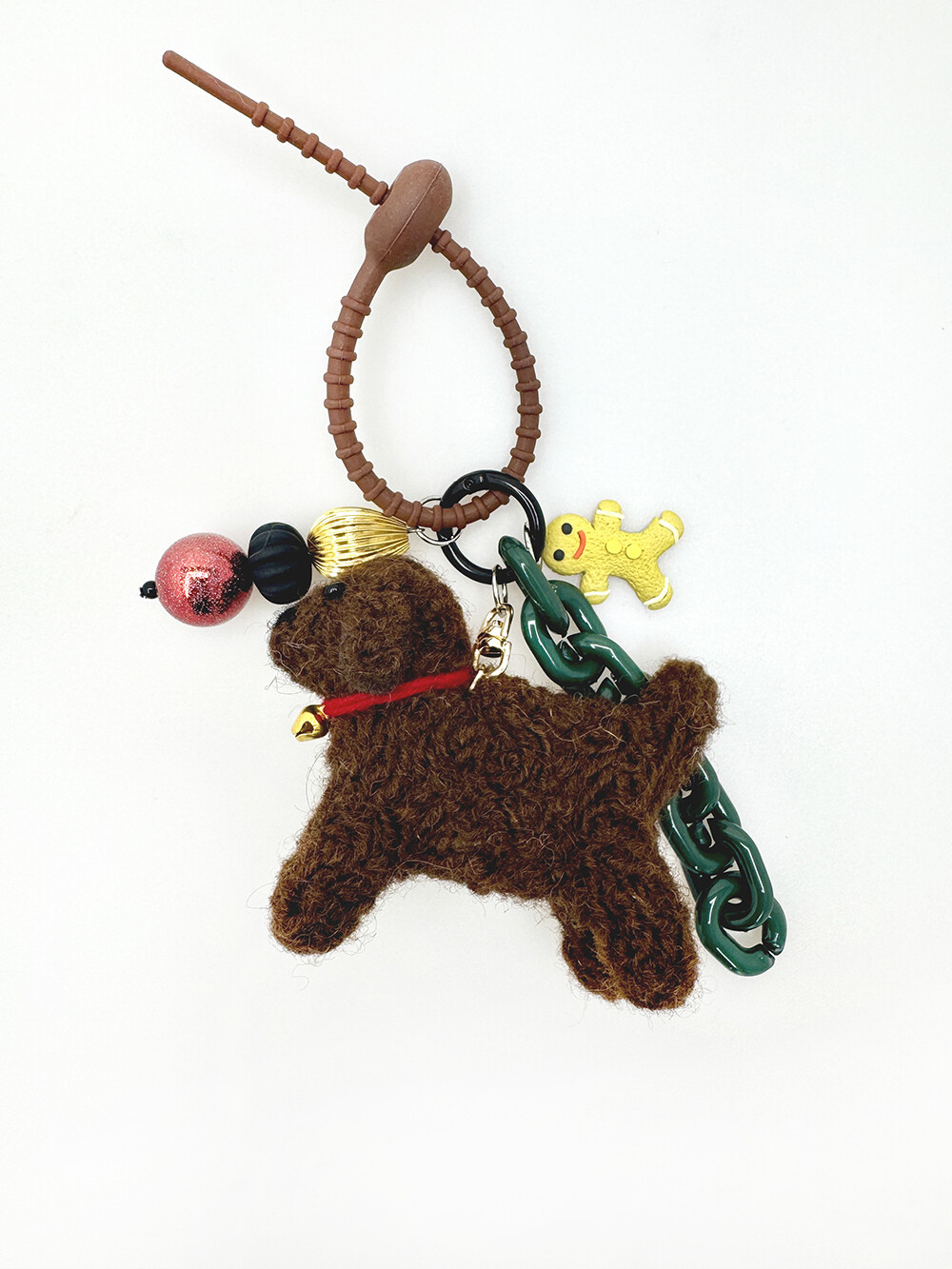 빨간 실에 골드 미니벨을 달고 있는 복실복실 퍼피 백참 입니다.