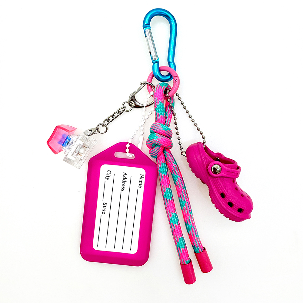 비비드한 컬러감의 매듭과 빅사이즈 네임택, 귀여운 클로그가 달린 핑크 톤온톤의 백참입니다.