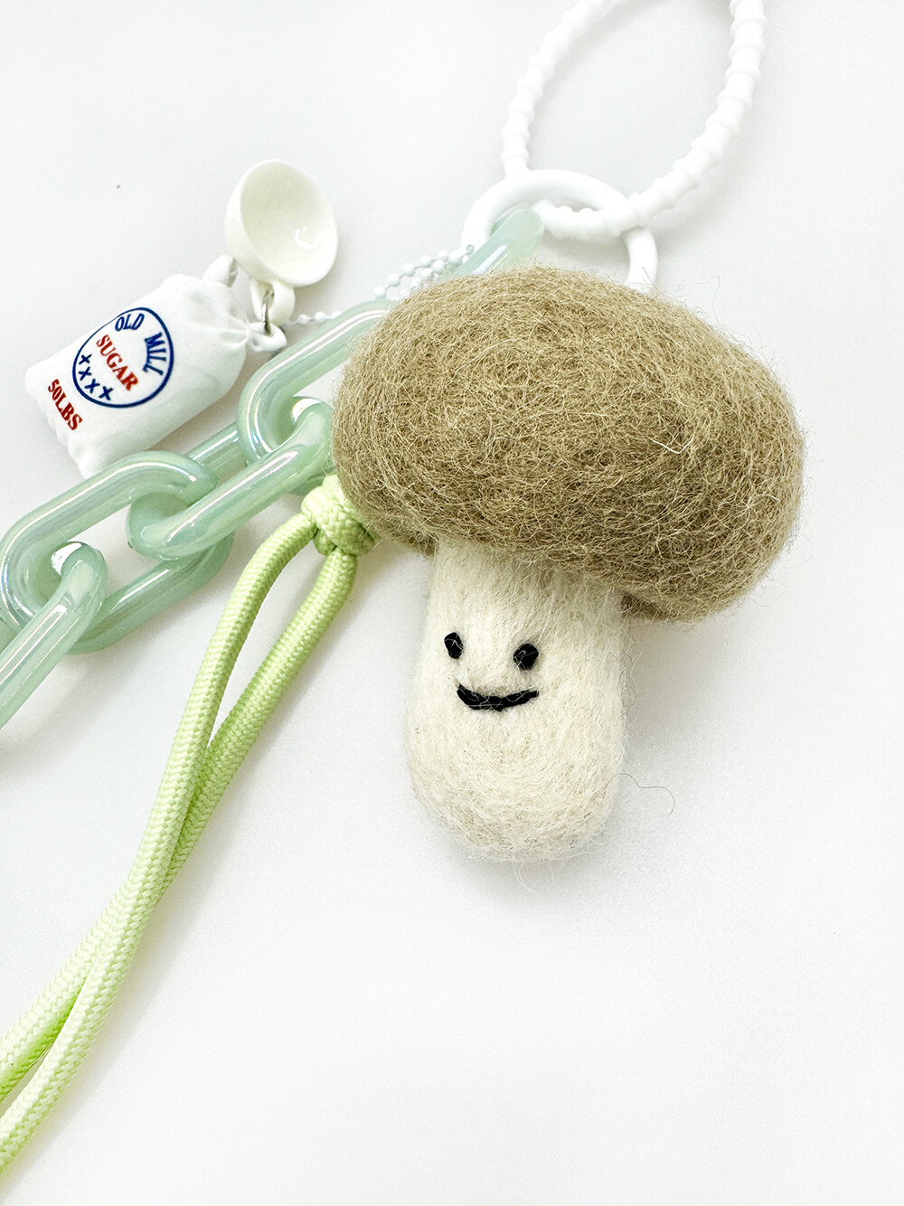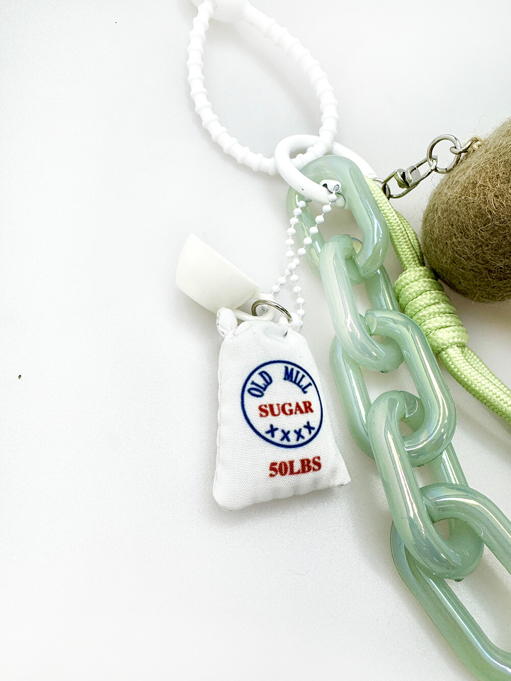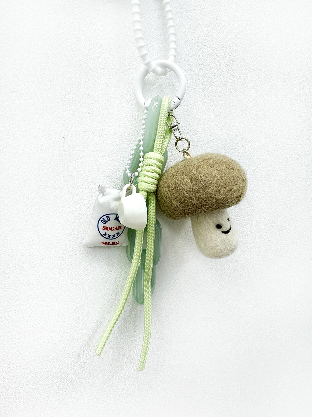 민트 톤의 매듭 과 볼드한체인참에 설탕포대 와 티컵을 달아준