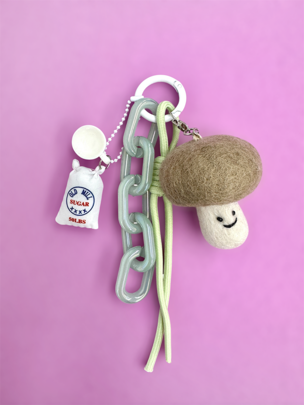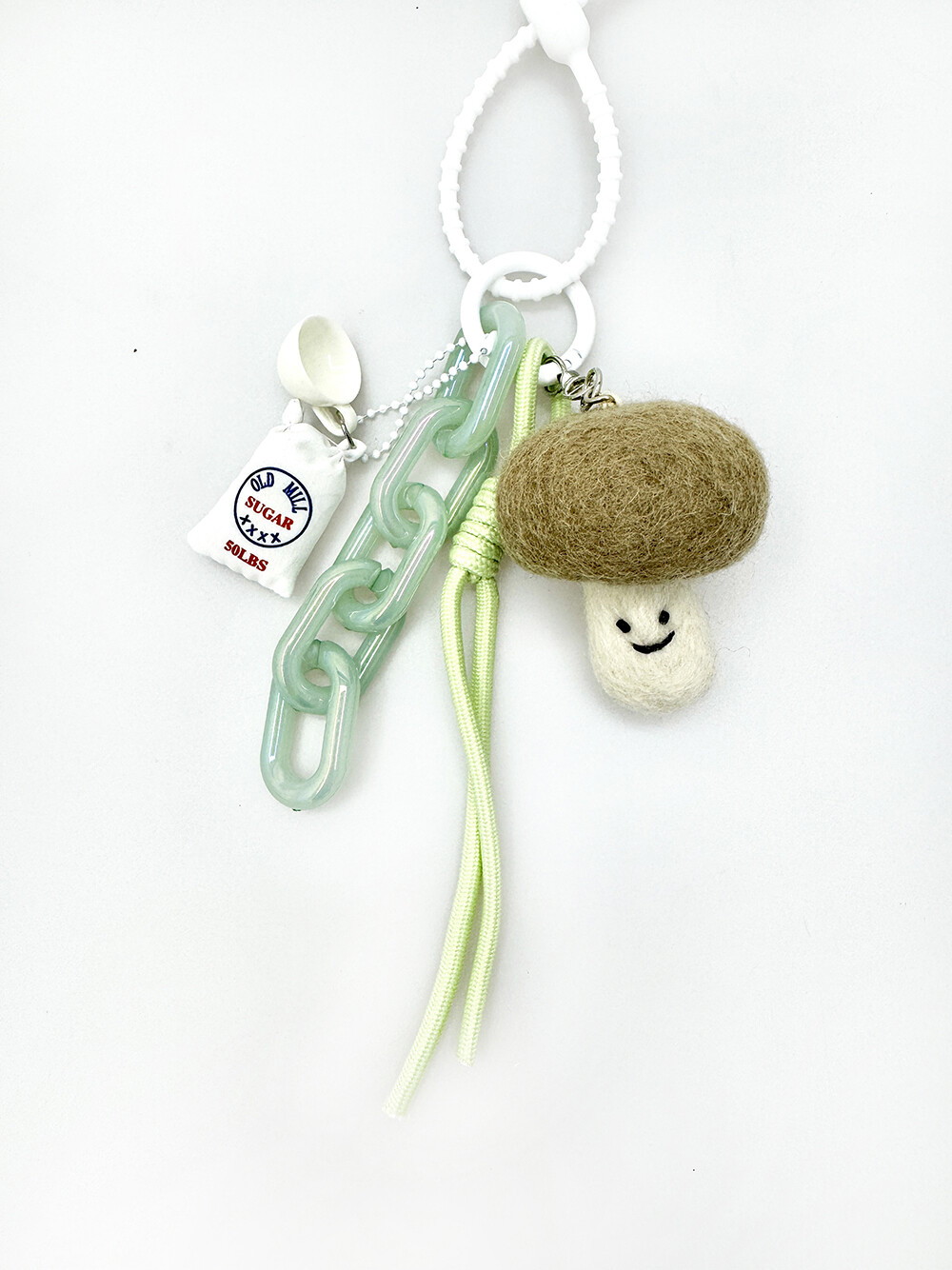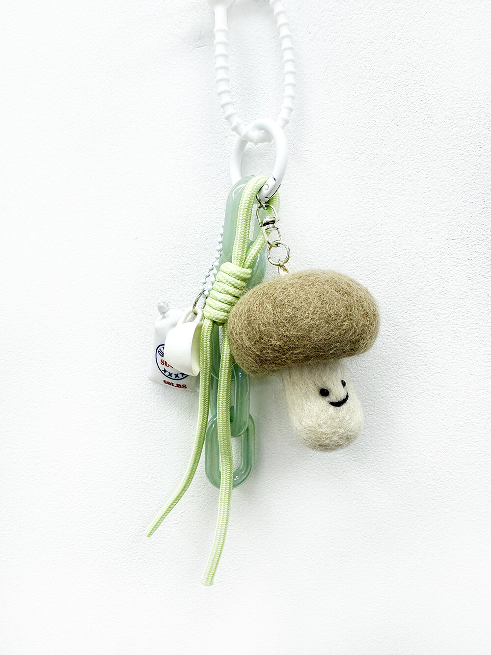 민트 톤의 매듭 과 볼드한체인참에 설탕포대 와 티컵을 달아준